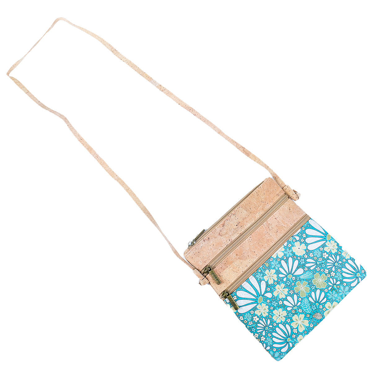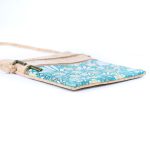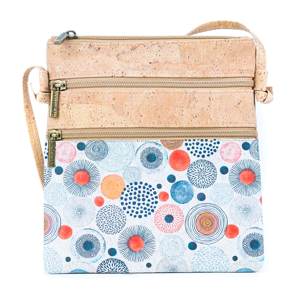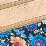 The front of the bag showcases a vibrant, colorful pattern that adds a captivating flair, while the top is adorned with rustic, natural cork, reflecting the beauty of the natural world. Whether you’re heading out for a casual day or an evening event, the Structured Crossbody Bag is designed to complement your style with its intricate details and sustainable design.